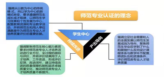 师范类专业认证理念为“学生中心,产出导向,持续改进”,这 是师范类专业认证工作的行动指针,贯穿师范类专业认证全过程。