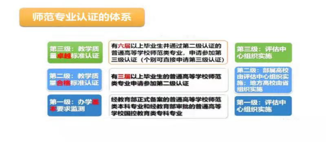 第一级定位于师范类专业办学基本要求监测。第二级定位于师范类专业教学质量合格标准认证。第三级定位于师范类专业教学质量卓越标准认证。
