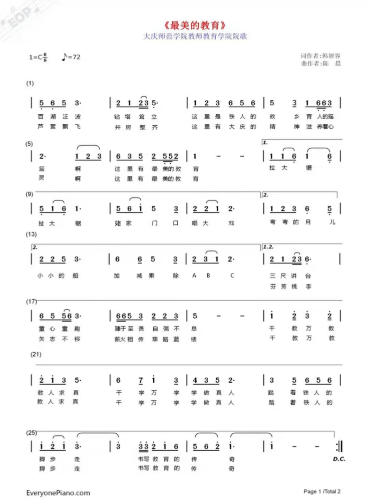 《最美的教育》歌词言简意赅,朴实自然,既反映了学院人才培养的特色,也彰显了学院教师和学生两代师表、勇担重任的情怀。歌曲旋律悠扬,采用了律动性和抒情性较强的八六拍节拍,平稳的节奏型增强了歌曲的坚毅感。整首歌充满激情,富有激励作用,适于传唱。