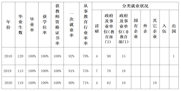 学院通过问卷调查、电话回访等方式调查显示,用人单位毕业生的满意度均达到90%以上。绝大部分用人单位认为本专业毕业生师德修养、教育情怀、从教信念、适应性等方面素质好,专业知识较扎实,执教能力强,展现出良好的科学及人文素质、较强的应用能力和创新意识。