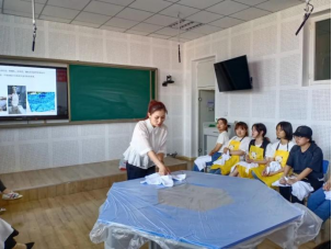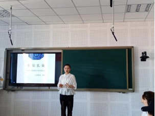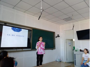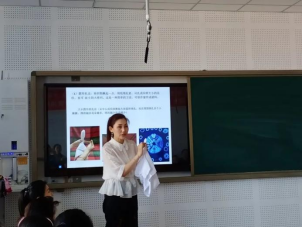 活动开始前,李明老师在教室给大家讲解了扎染的来源与发展,并详细地向大家讲解了扎染制作的要领、技艺及各种有趣的捆扎方式。