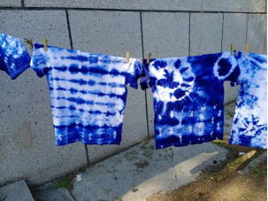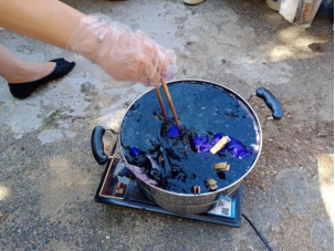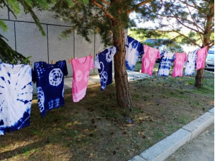 进入“染”的环节,李明老师带领同学来到室外一起将扎好的衣服和背包煮染、拆线、晾干。同学们站在染锅旁,静静地等待着一件属于自己“独一无二”的扎染T恤。