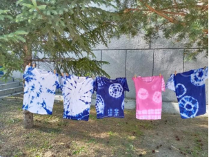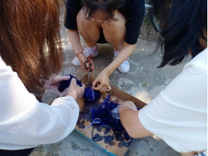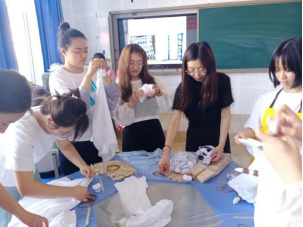 到了最期待的DIY环节,同学们早已按耐不住心中的激动,拿起手旁的衣服和背包,发挥各自的奇思妙想,借助皮筋、棉线、夹子等工具扎出一个个姿态各异的作品。
