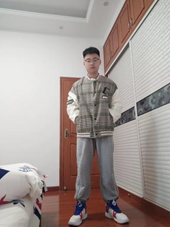 搭配灰色卫裤,白色运动鞋