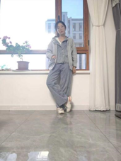 蓝色牛仔外套搭配阔腿裤