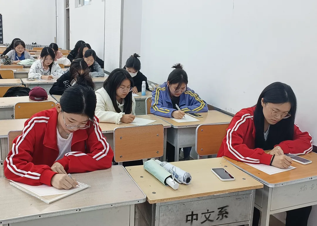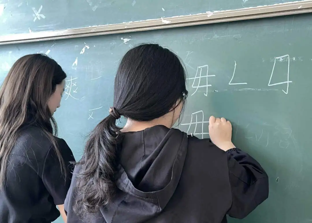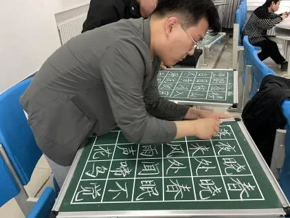 两字一画比赛内容为钢笔字、粉笔字、简笔画三个项目,检验了参赛选手的教师职业技能的水准。两笔字比赛中专注书写的身影,或规范、或灵动气质的字,显示出书院学子扎实的写字风范。结构的疏密、点画的轻重、运笔的轻重缓急展示出了师范生扎实的书写功底。