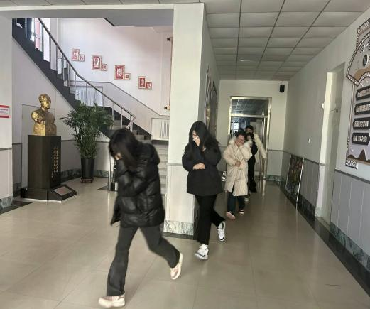 快问快答环节结束后,伴随着一阵急促的警报声,全体工作人员各司其职,迅速组织学生疏散。各班学生在工作人员的指挥下,按照指定路线,弯着腰,捂着口鼻,有序撤离至正门前。