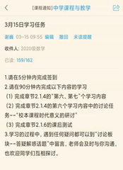 第二步,“引领式自学”。学生借助网络平台进行自主学习时,教师则进行监控和引领。《中学课程与教学》课程在线开课阶段,全程引领学生自学,并充分发挥教师的引导作用,教会学生学习。