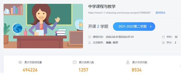 课程介绍:课程与教学是学校教育的基本工作,如何科学化的解决课程与教学问题是师范专业学生必须学习的一门重要课程。2022年,疫情突变,为充分响应学校线上教学的号召,《中学课程与教学》于2月底便在超星泛雅学习通平台开课,截至目前,已有来自全校2020级7个师范专业,656名学生以教师教育必修课程每周2课时的形式学习了本门课程。