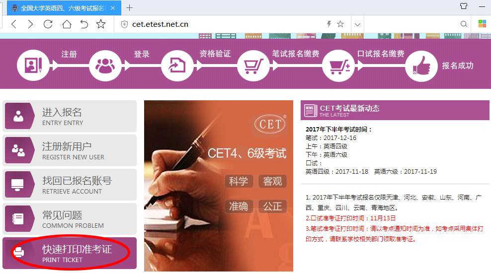 2017年下半年全国大学英语四、六级考试准考证下载打印流程