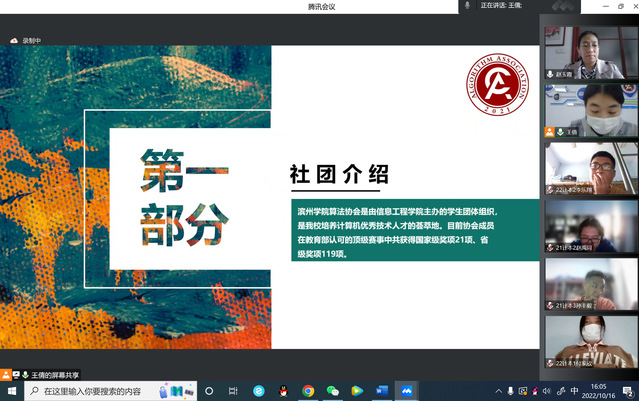 2022年10月16日下午4:00,通过腾讯会议App以线上形式成功举办滨州学院算法协会换届大会。指导教师赵玉霞和...